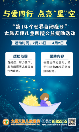 今年4月2日是第14个自闭症日,为了帮助自闭症儿童减轻治疗负担,太原天使儿童医院携手天使公益圆梦驿站开展了“第14个自闭症日”太原天使儿童医院公益援助活动。