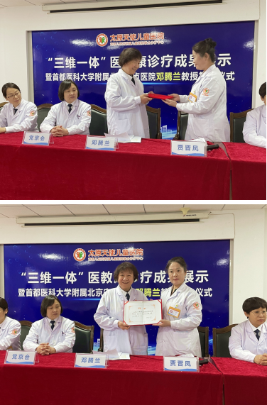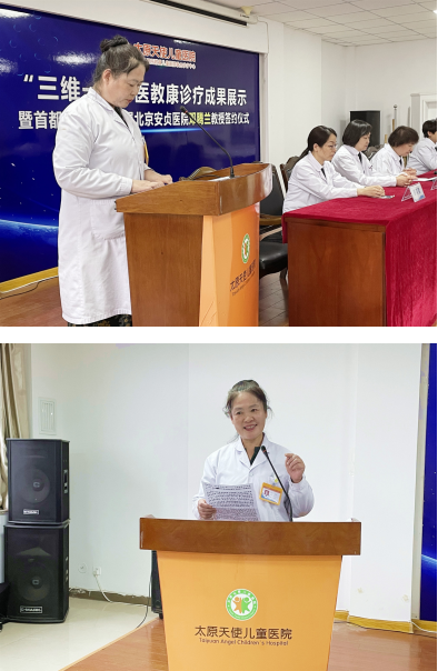 邓腾兰医生表示:非常荣幸加入太原天使儿童医院京晋医生会诊团,也很开心在这里与大家共同见证”三维一体“医教康诊体系的成果展示,今后,我将运用我的医术,运用”三维一体“医教康诊体系,与更多的京晋医生会诊团,在太原天使儿童医院,一起为特殊疾病儿童把脉护航,为广大患儿带来康复希望。