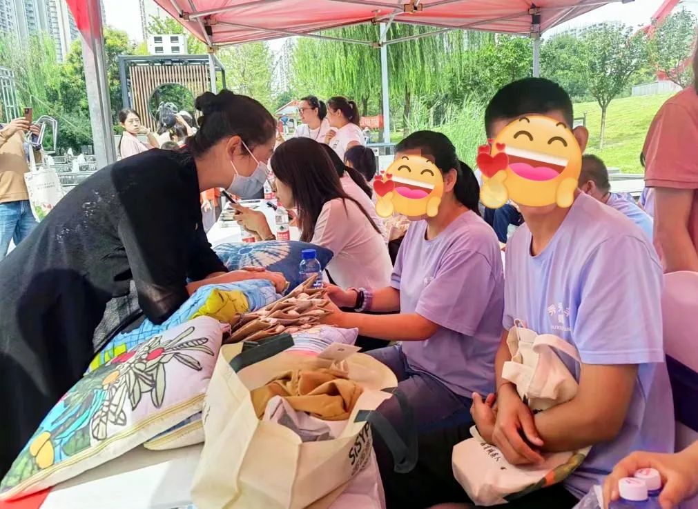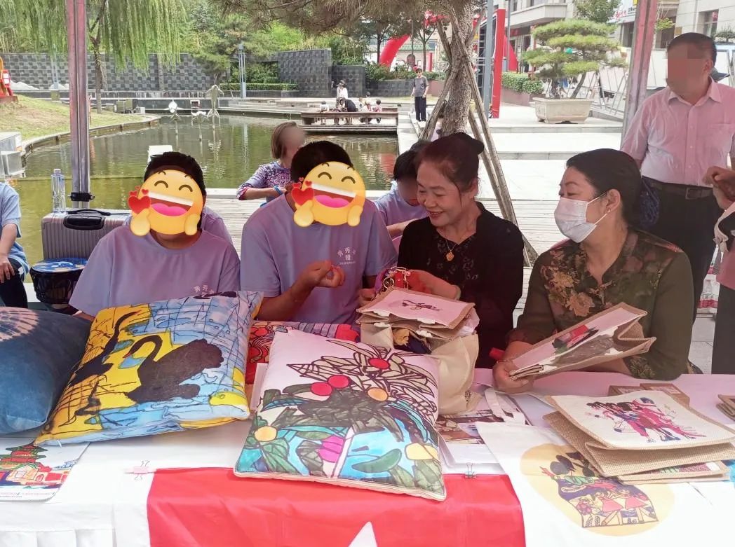 在天使志愿者的帮助下,孩子们顺利完成节目表演。随后,志愿者把孩子们做的抱枕、帆布包、钥匙扣等手工作品进行分类展示,主动向路人宣讲残疾预防知识,呼吁社会大众共同关爱心智障碍人群。