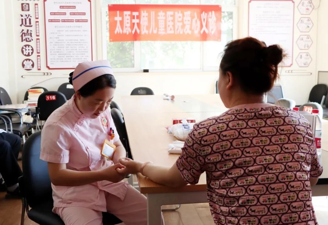 义诊现场,太原天使儿童医院医生杨捷主任带领医护人员为居民把脉问诊,杨捷主任结合多年的临床工作经验,一边为居民答疑解惑,一边详细询问就诊者的身体状况,耐心细致地检查、分析病情,并针对不同病症和个体差异给予个体化治疗方案,获得居民的一致好评。