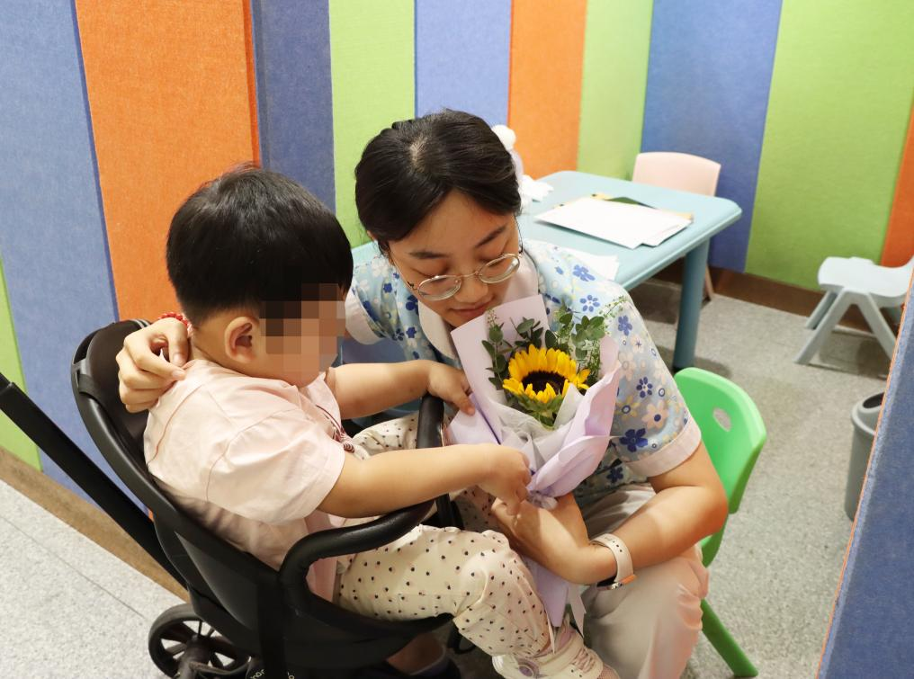 看到可以为老师送花,孩子们纷纷上前拿起鲜花,献给喜欢的老师。患儿小乐刚到院就诊时不会说话,现在已经可以捧上鲜花对着老师说“老师辛苦了,教师节快乐”,小乐妈妈也紧紧握着康复老师的手表达感恩之情。